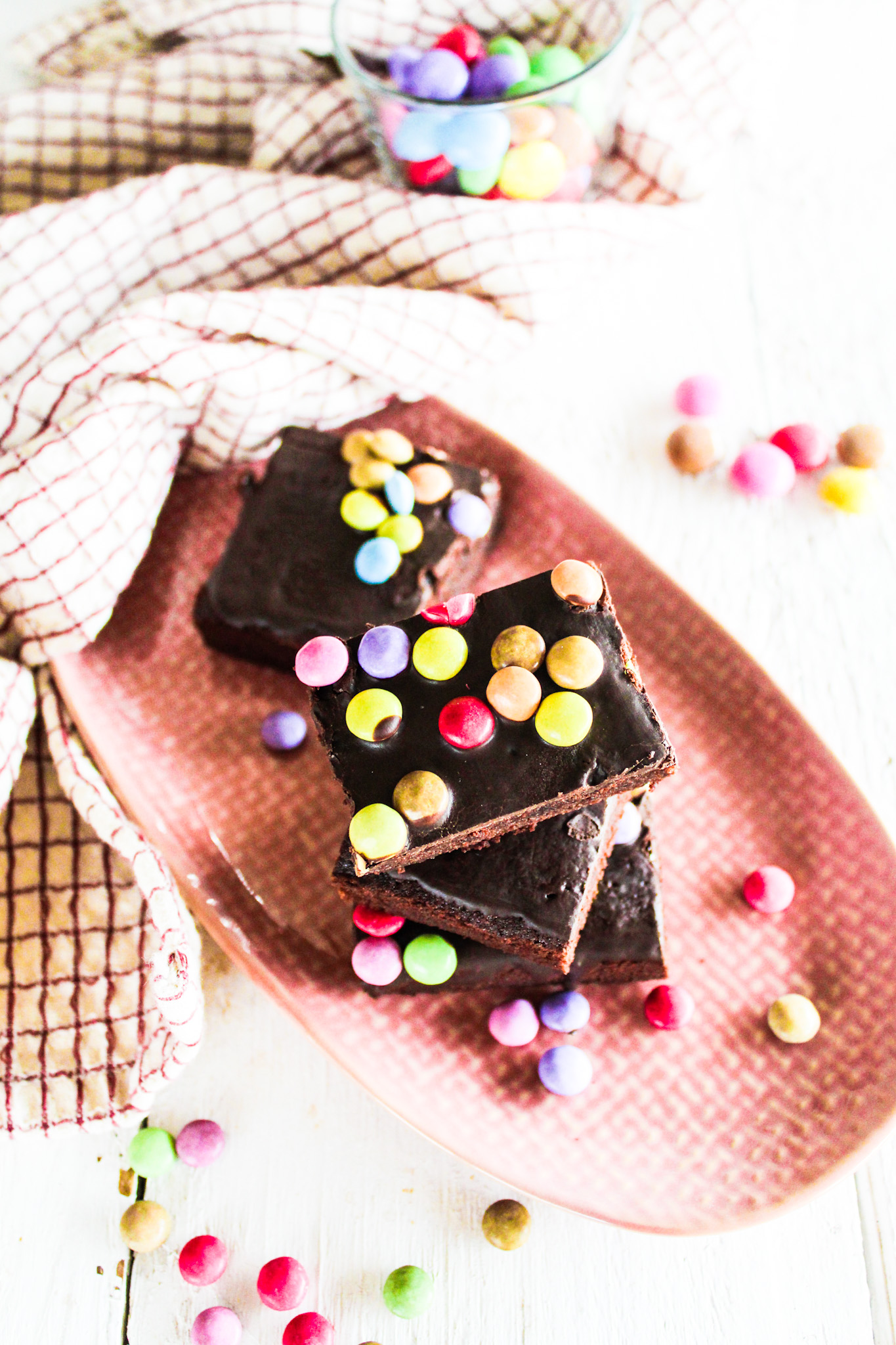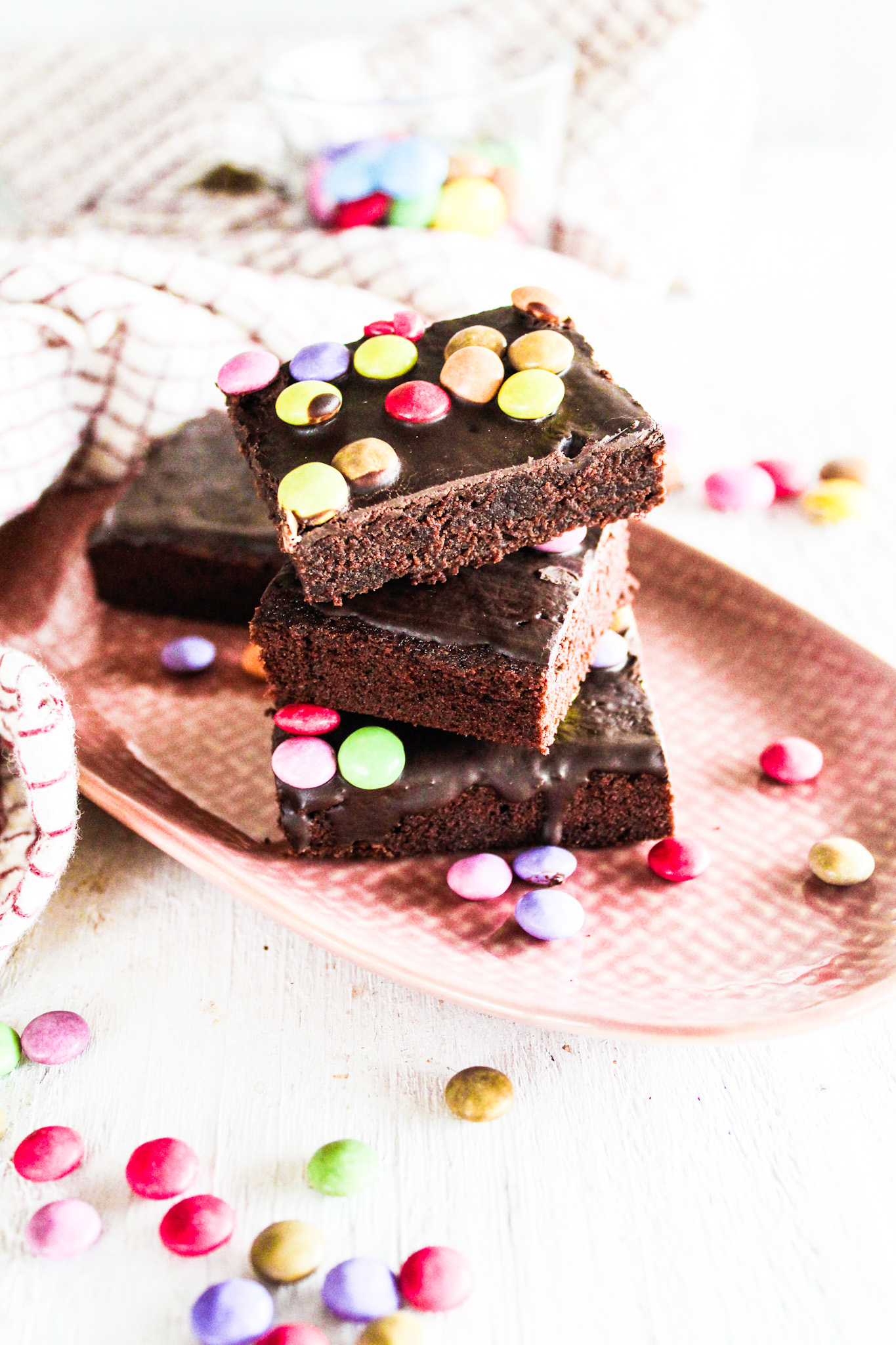 Ihr könnt die Brownies natürlich auch beliebig mit dem Topping wählen. Anstatt Schokolinsen und Schokoglasur würde natürlich auch einfach nur Puderzucker gehen. Krokant oder Nüsse schmecken auch super als Topping. Einfach mal alles ausprobieren. Ich habe auch schonmal ein Blech gemacht und jede Spalte einzeln belegt, mal mit Nüsse, mal Schokolinsen, Schokostreusel, bunte Streusel etc.