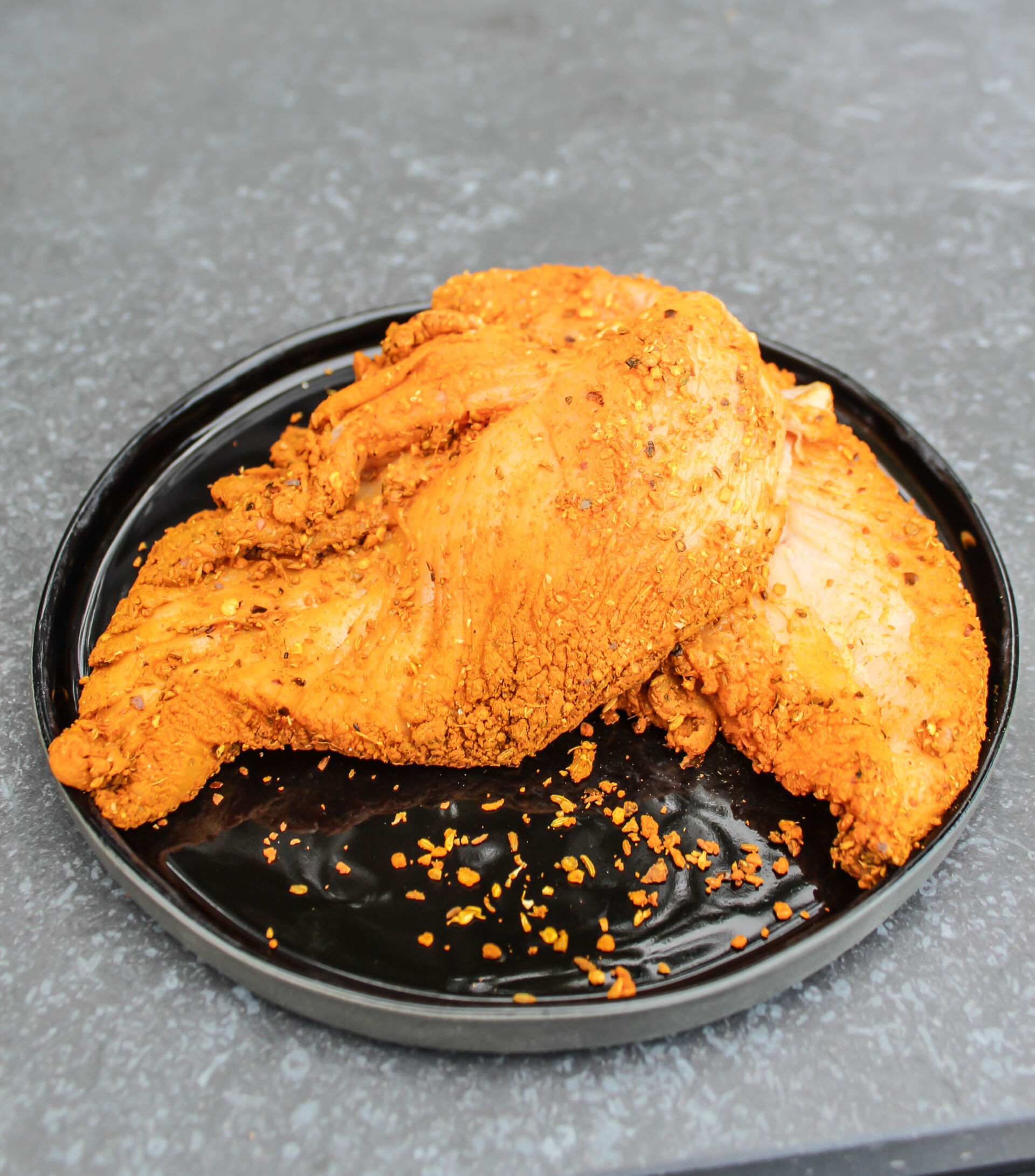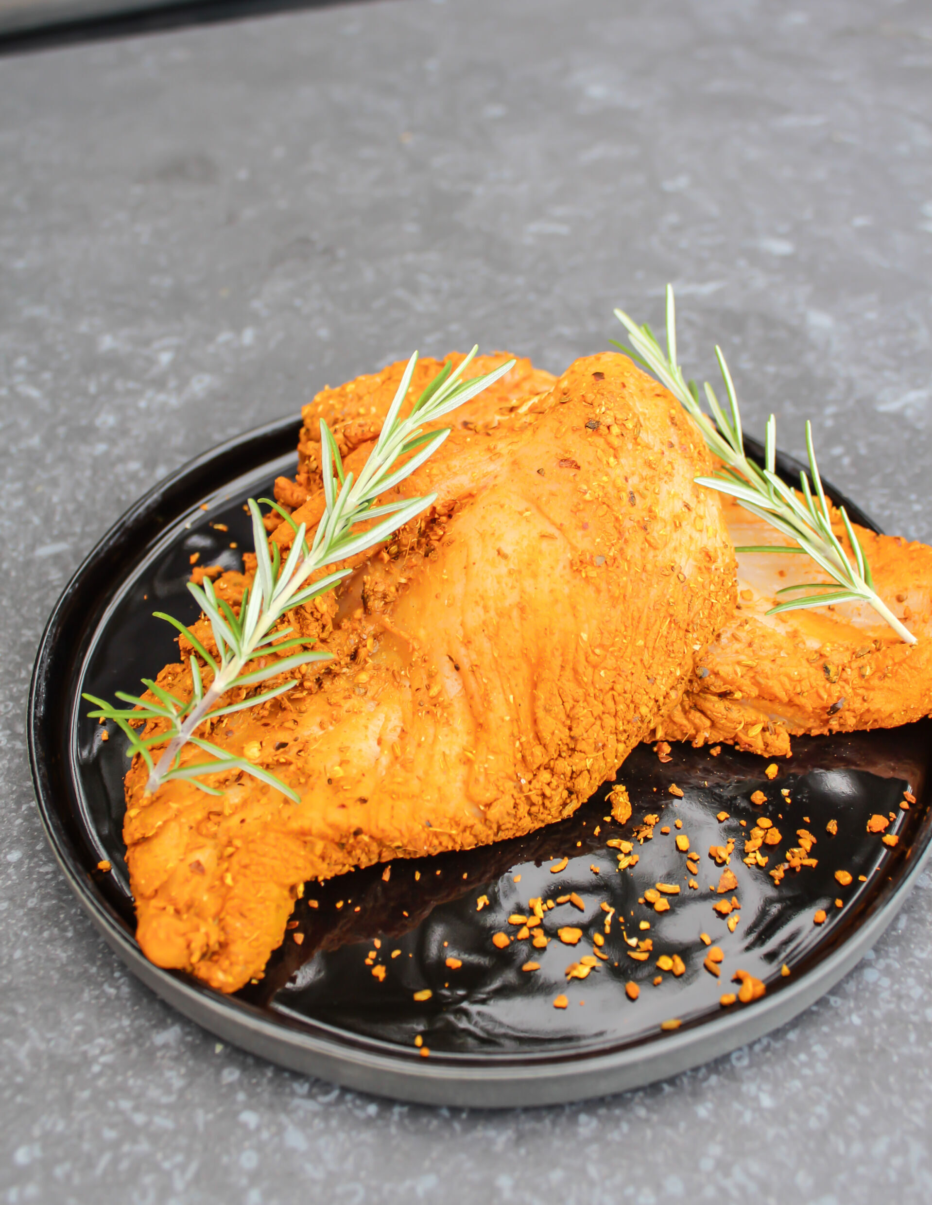 - Zunächst das Hähnchen waschen. Mit Curry/Salz und Pfeffer von allen Seiten einreiben. Anschließend geben wir das Hähnchen in einen Beutel und lassen es mit dem Rosmarin ca. 1 Stunde im Kühlschrank durchziehen.