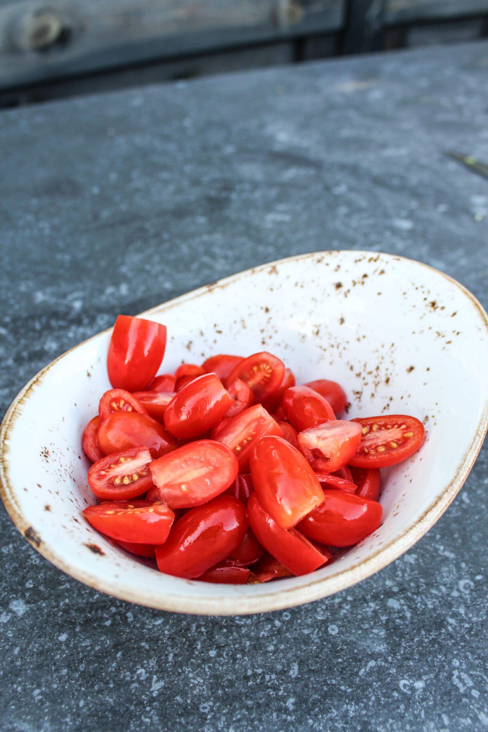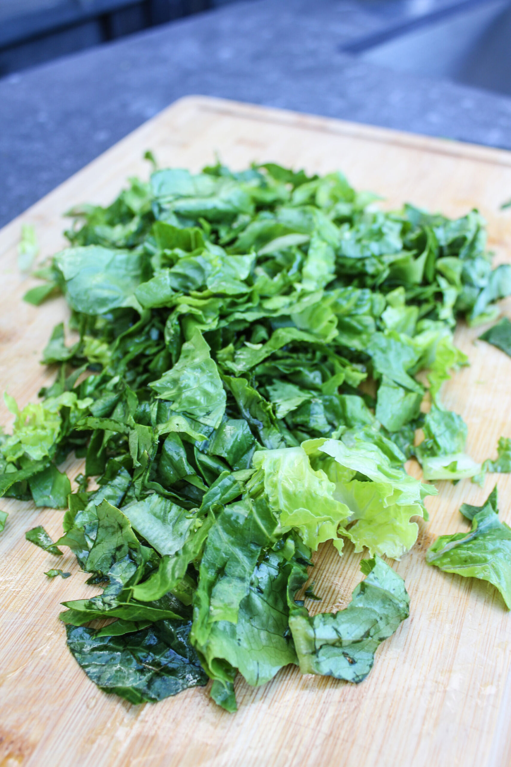 - Salat waschen und ganz klein schneiden. Die Cocktailtomaten halbieren.