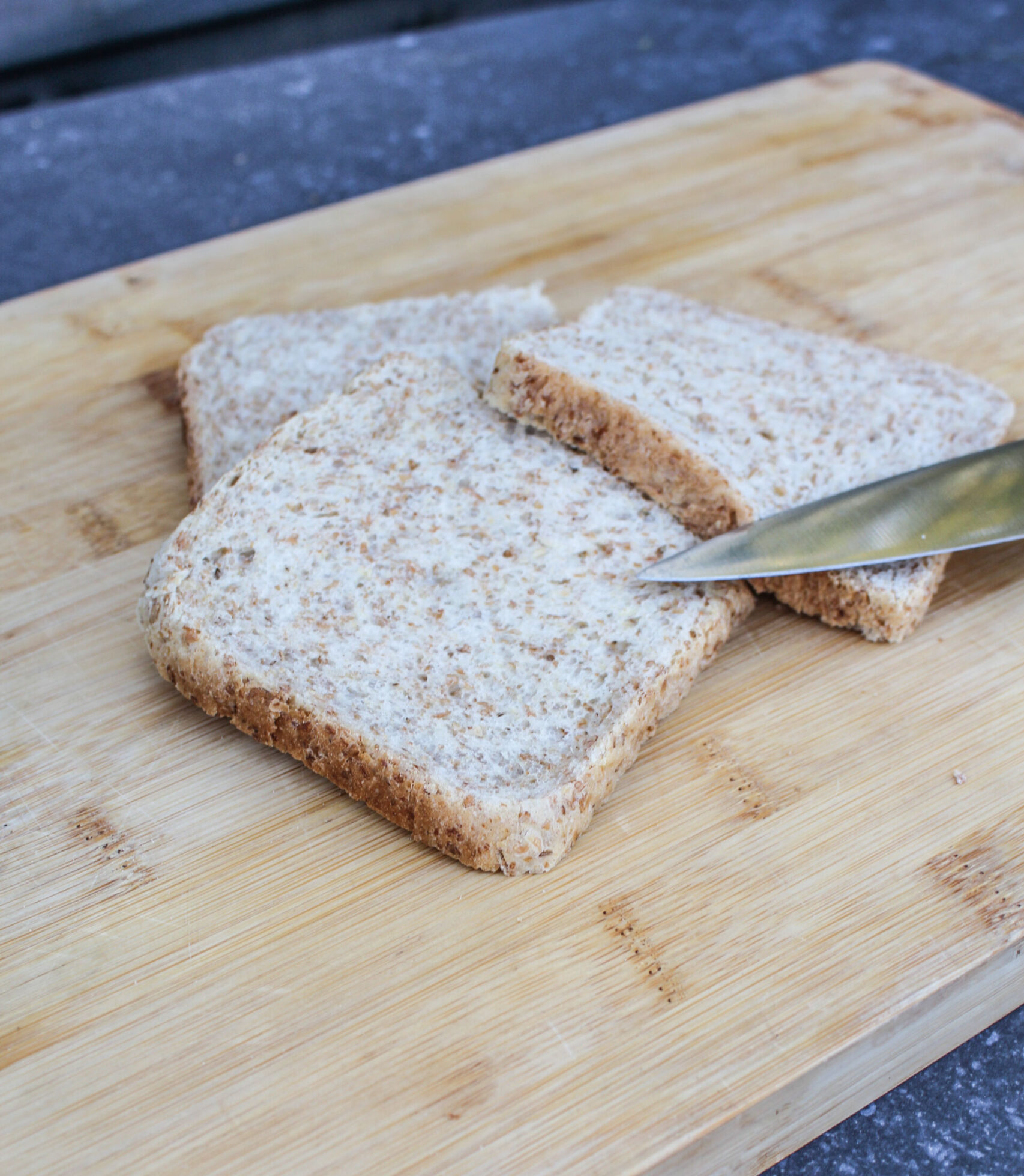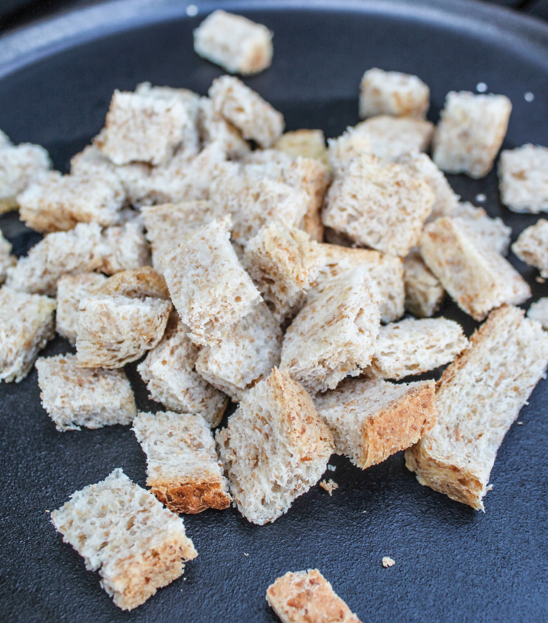 - Anschließend schneiden wir das Toast in kleine Würfel und geben sie in eine Pfanne mit Olivenöl. Knusprig von jeder Seite anbraten. Zur Seite legen und erkalten lassen.
