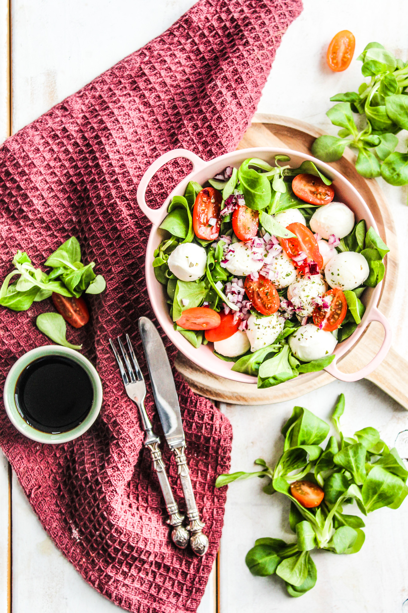 - Die rote Zwiebel in ganz kleine feine Würfel schneiden. Cocktailtomaten halbieren und den Babymozzarellen auf dem Salat verteilen.