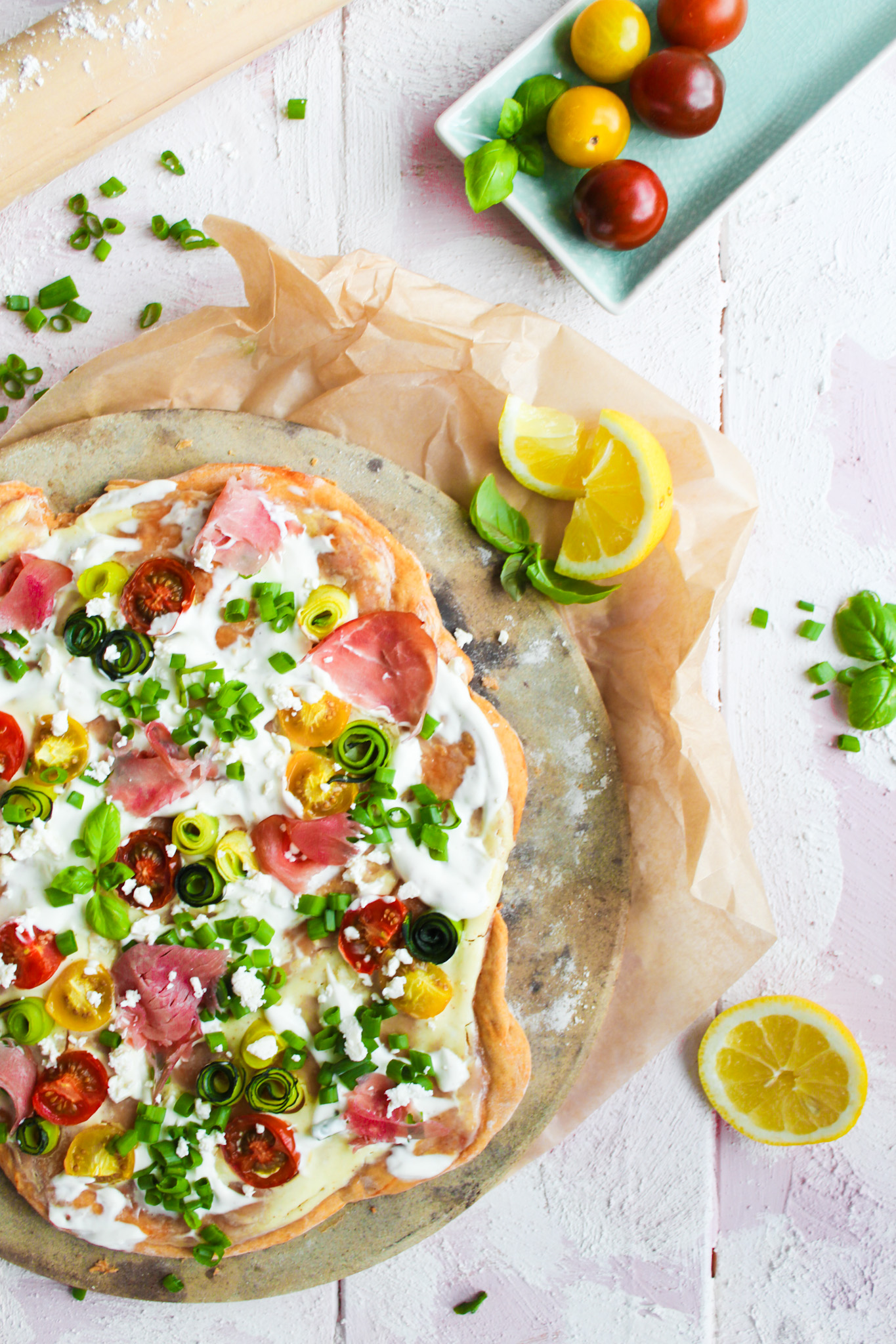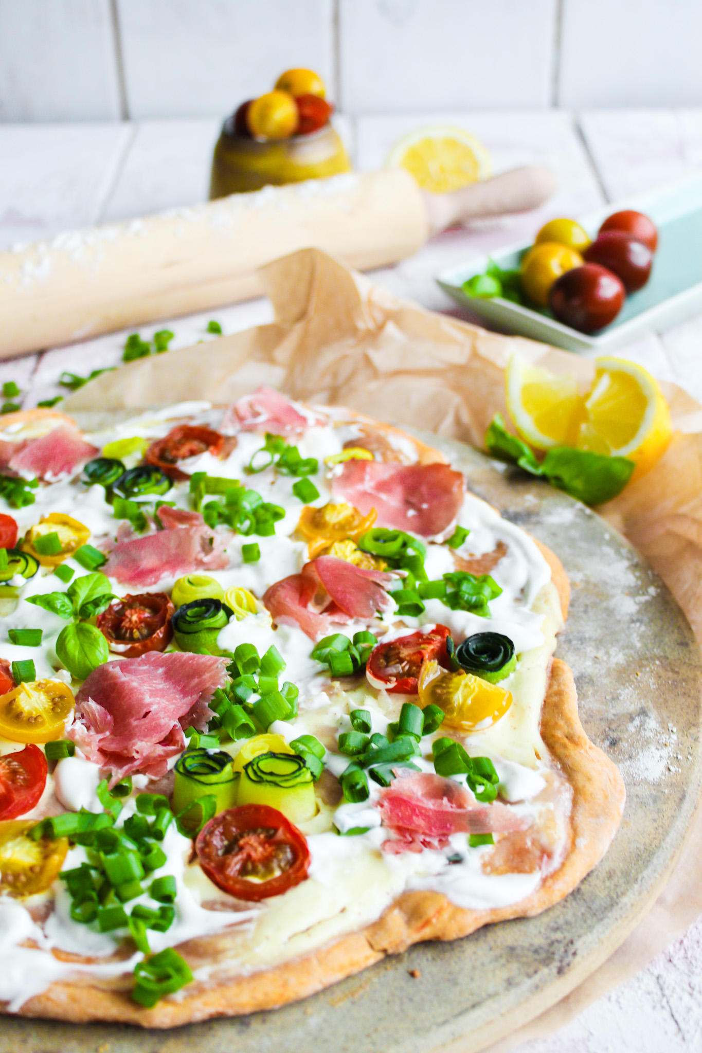….und wie ihr mich schon kennt sollte es ein farbenfrohes Rezept ebenfalls sein. Zucchini, Lauchzwiebeln, Schinken, Cocktailtomaten und viele andere Leckereien standen auf meiner Zutatenliste. Ihr könnt den Flammkuchen natürlich auch im Backofen machen, wir haben aber bei Dreh den Grill angeschmissen und los ging es. 🙂