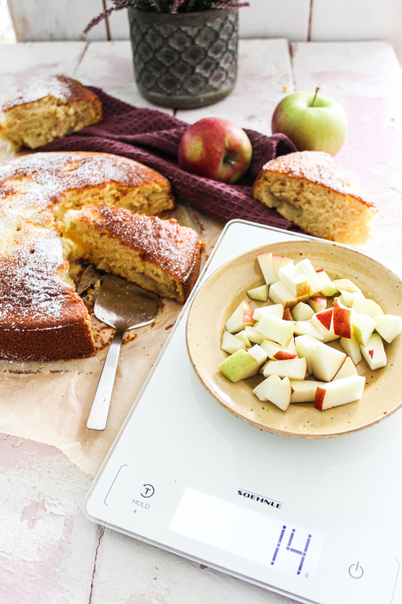 Hast du schon Äpfel gepflückt? Jedes Jahr kommt die wunderbare Erntezeit der Äpfel. Ich bin dann oft bei meiner Schwiegermama und bekomme dort super leckere Äpfel oder hole sie hier im Dorf aus dem Laden. Und dann muss es natürlich immer Apfelkuchen geben, ich liebe ihn total. Dieses Mal habe ich mal ein neues Rezept ausprobiert und einen fluffigen Apfelkuchen gebacken und endlich dabei einen super toll designten Helfer dabei gehabt.