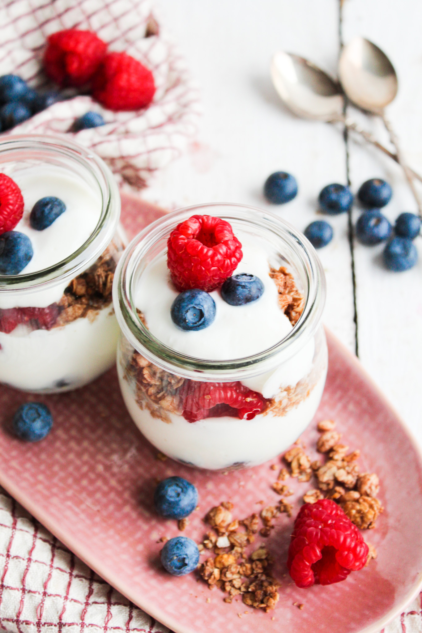 - Abwechselnd Obst/Joghurt und Granola im Glas verteilen.
