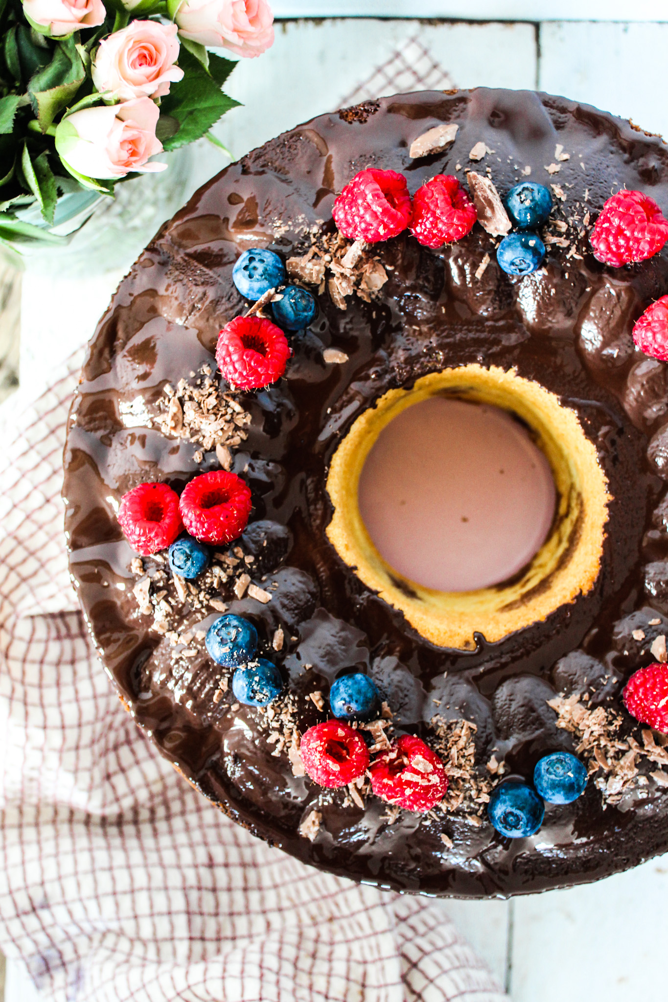 Wichtig ist dass ihr die Kirschen komplett abtropfen lasst damit am besten keine Flüssigkeit mehr vorhanden ist. Ansonsten wird der Teig zu wässrig wenn ihr die Kirschen dazu gebt. Für die Schokoglasur könnt ihr einen ganz normalen Drip verwenden mit 200 g Zartbitterschokolade und 100 g Sahne oder einfach eine fertige Schokoglasur, die ihr über einem Wasserbad schmelzen lasst.