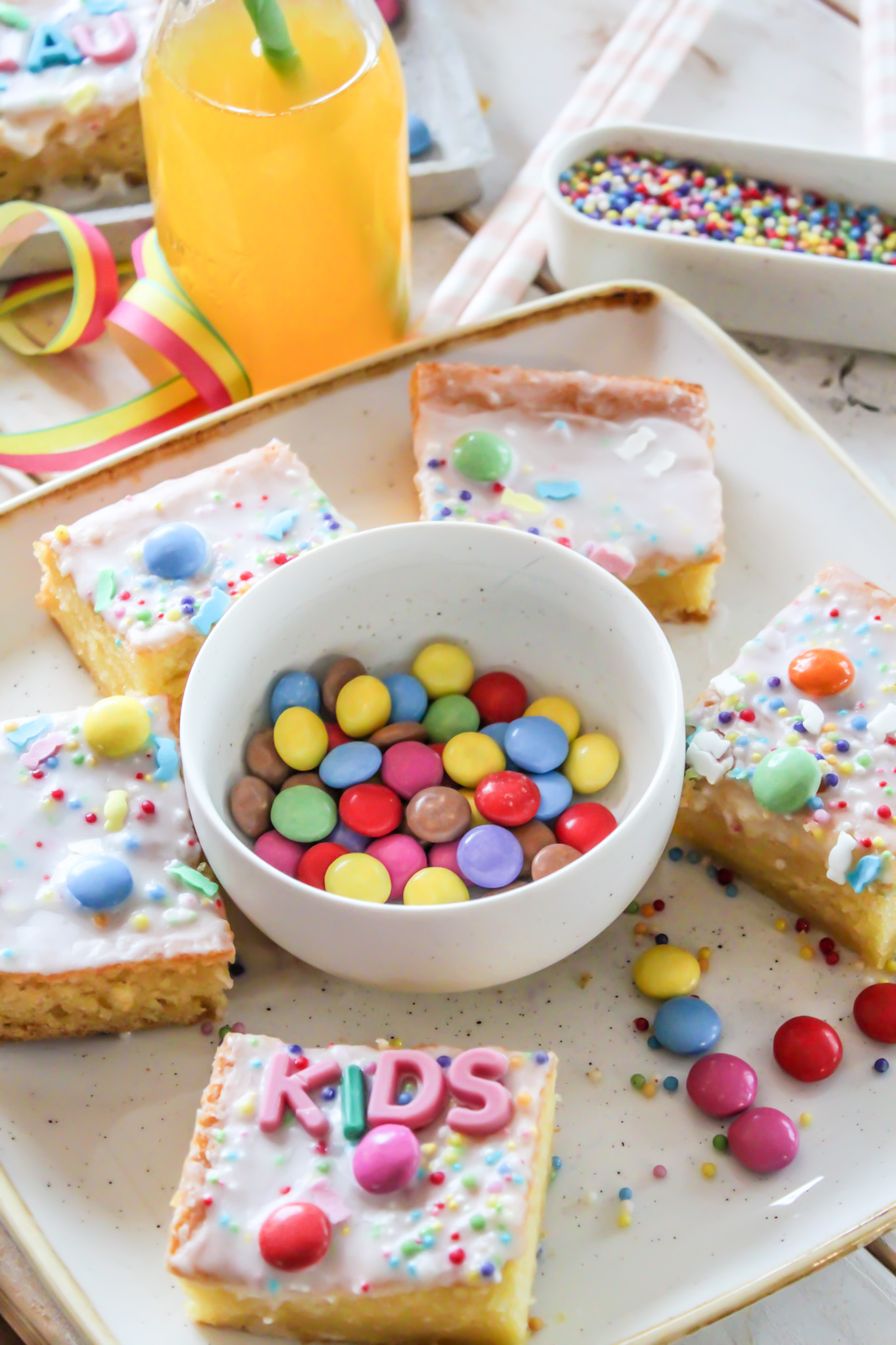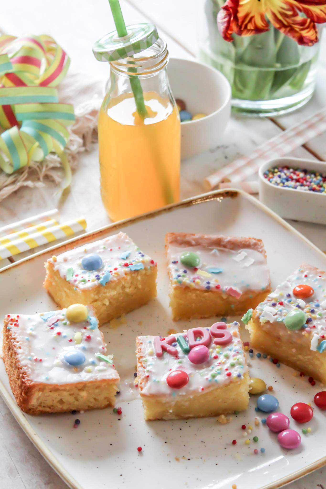 Ein echter Kids Kracher könnte man auch sagen. Welche Kids lieben ihn nicht?! Den Limonadenkuchen, ganz viel Streusel und Schokolinsen auflegen und die Kids Augen strahlen. Ich habe dieses Mal die Glasur mit Puderzucker und der Limonade gemacht. Ihr könnt aber auch hier einfach etwas Lebensmittelfarbe passend zum Anlass nehmen.
