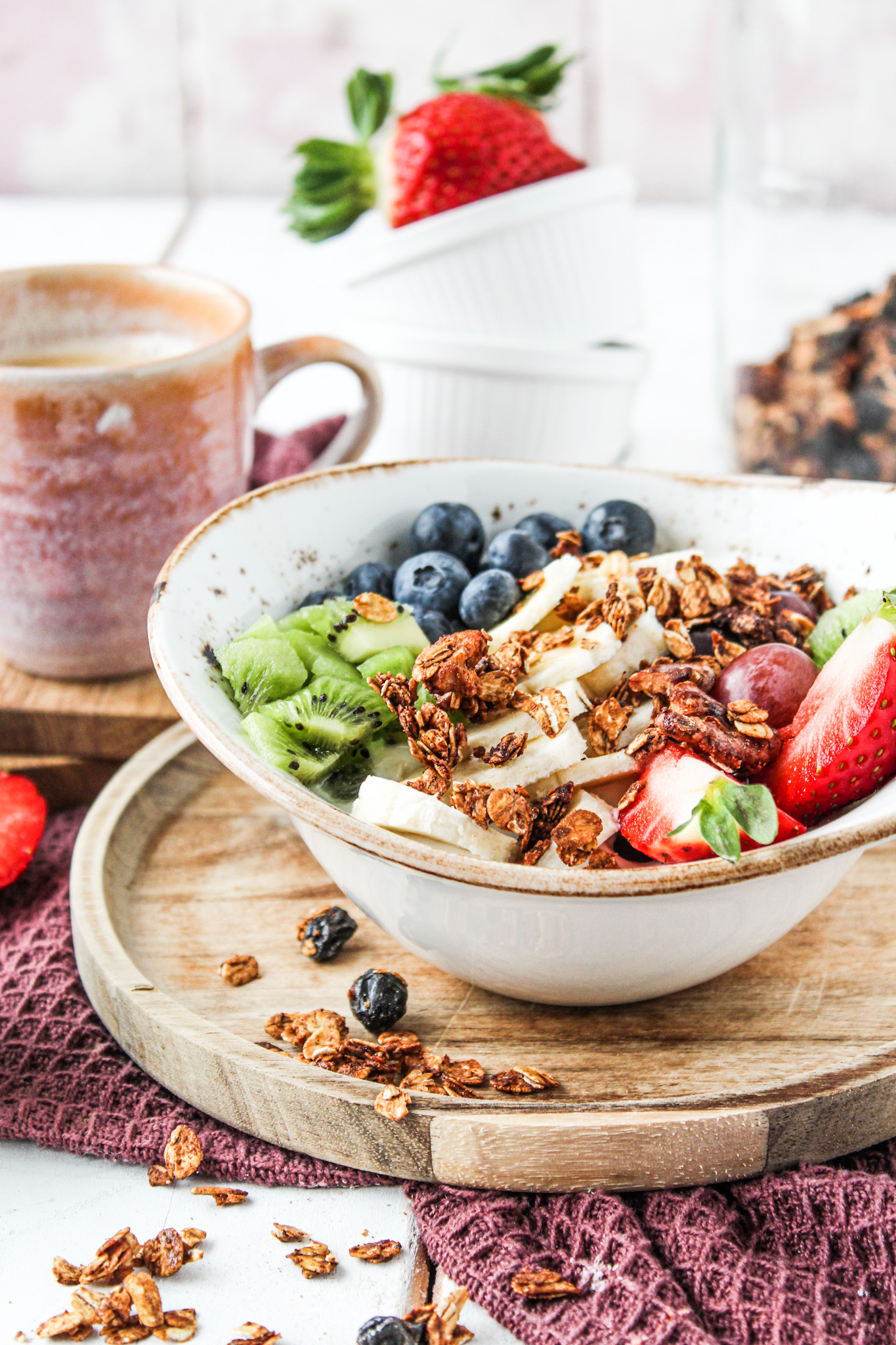 Mein Frühstück sieht ja eigentlich jeden Morgen so aus und ich könnte es auch immer wieder essen. Ich variiere da einfach mit den Beeren und so wie jetzt packe ich mal mein selbstgemachtes Granola mit rein. Schon schmeckt es total anders und hat den Crunch. Wenn ihr es etwas stehen lasst, löst sich der Honig noch wieder aus dem Granola, mhhhh das schmeckt fantastisch.