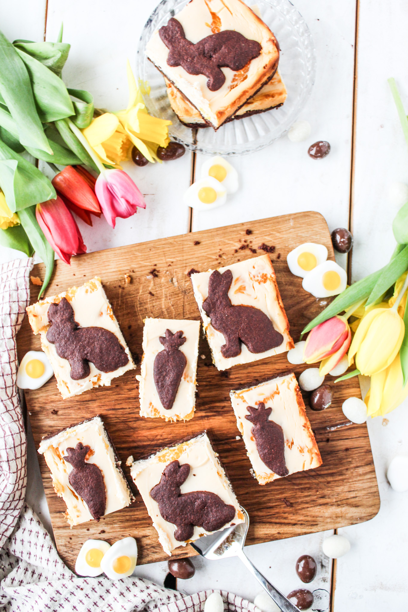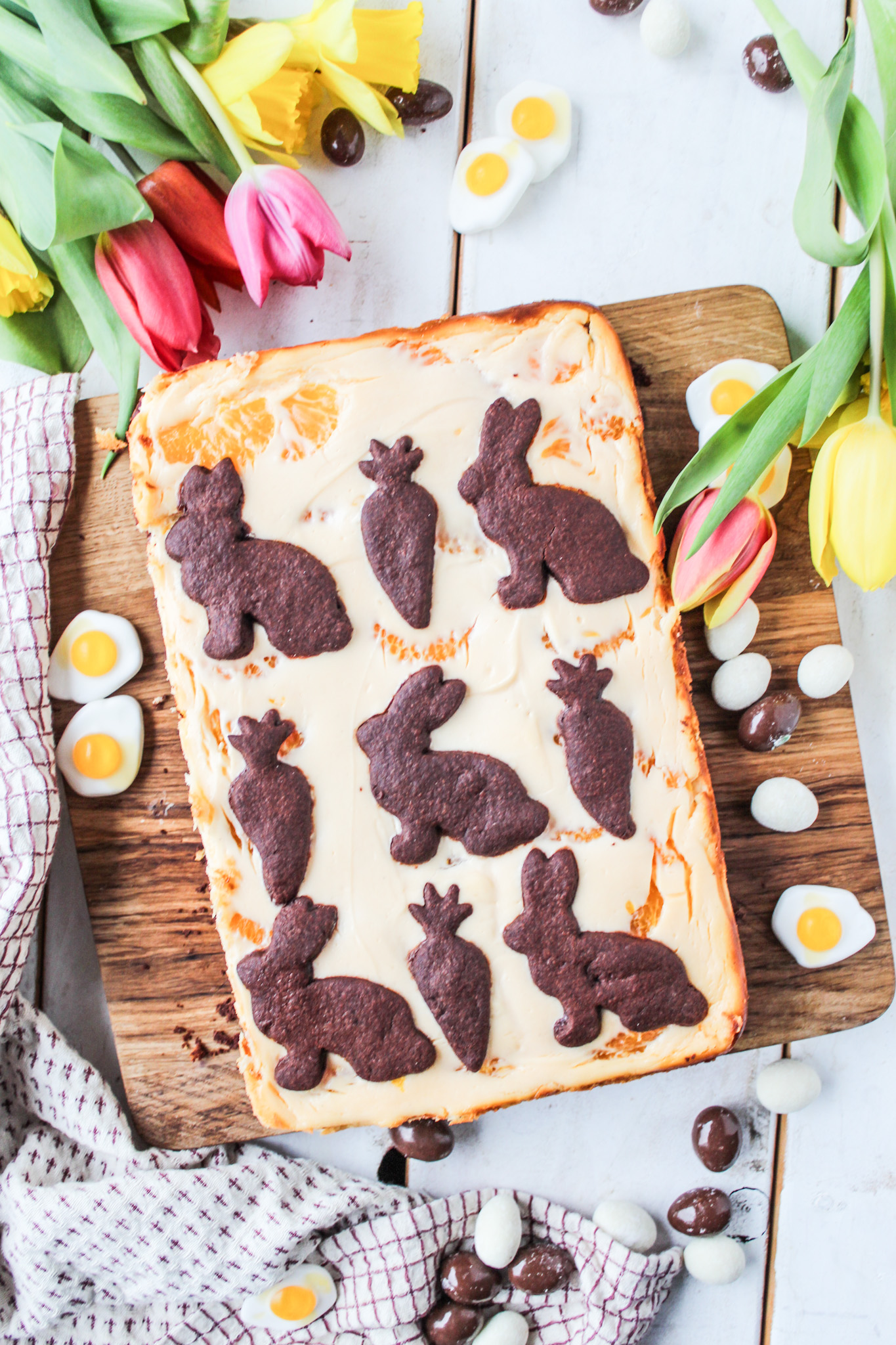Wenn du auf cremig, süß und saftig beim Kuchen stehst, dann habe ich hier genau den Richtigen für dich. Er ist so schnell zuzubereiten und schmeckt einfach fantastisch. Zu jeder Jahreszeit kann man ihn einfach vom Topping ändern und es sieht immer schön aus. Für die Osterzeit habe ich denn einfach aus dem restlichen Teig des Bodens kleine Möhrchen und Osterhasen ausgestochen.