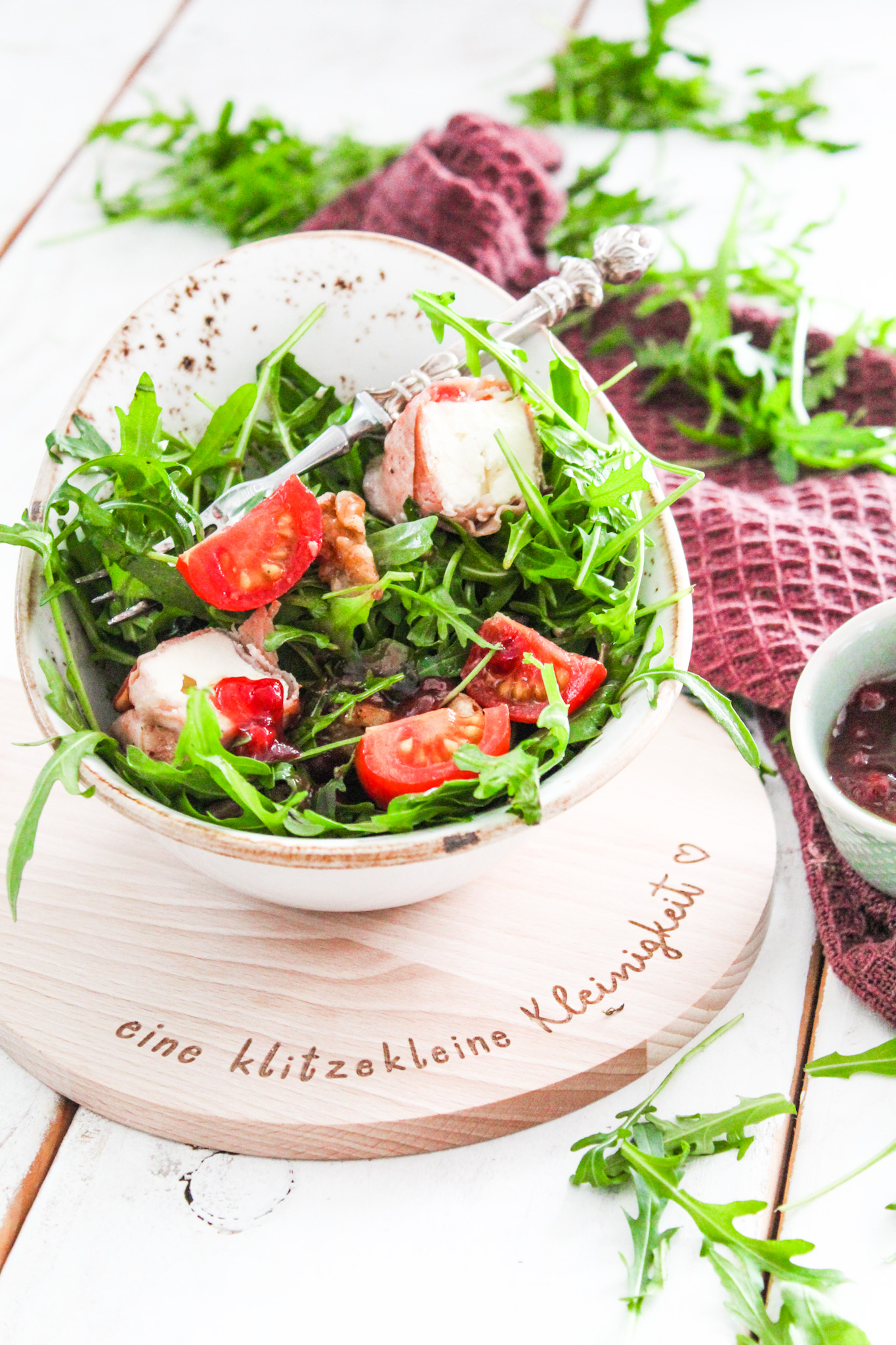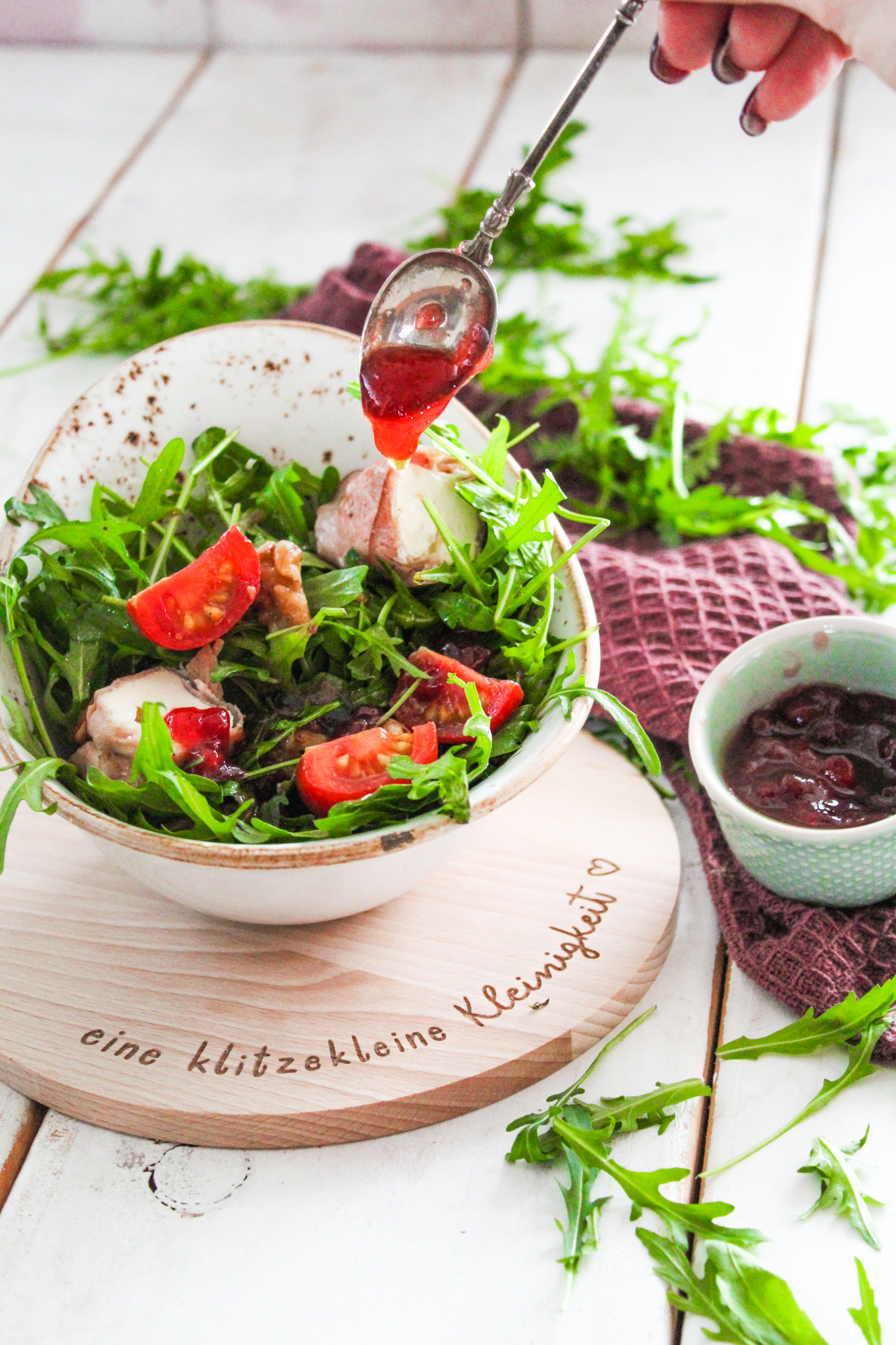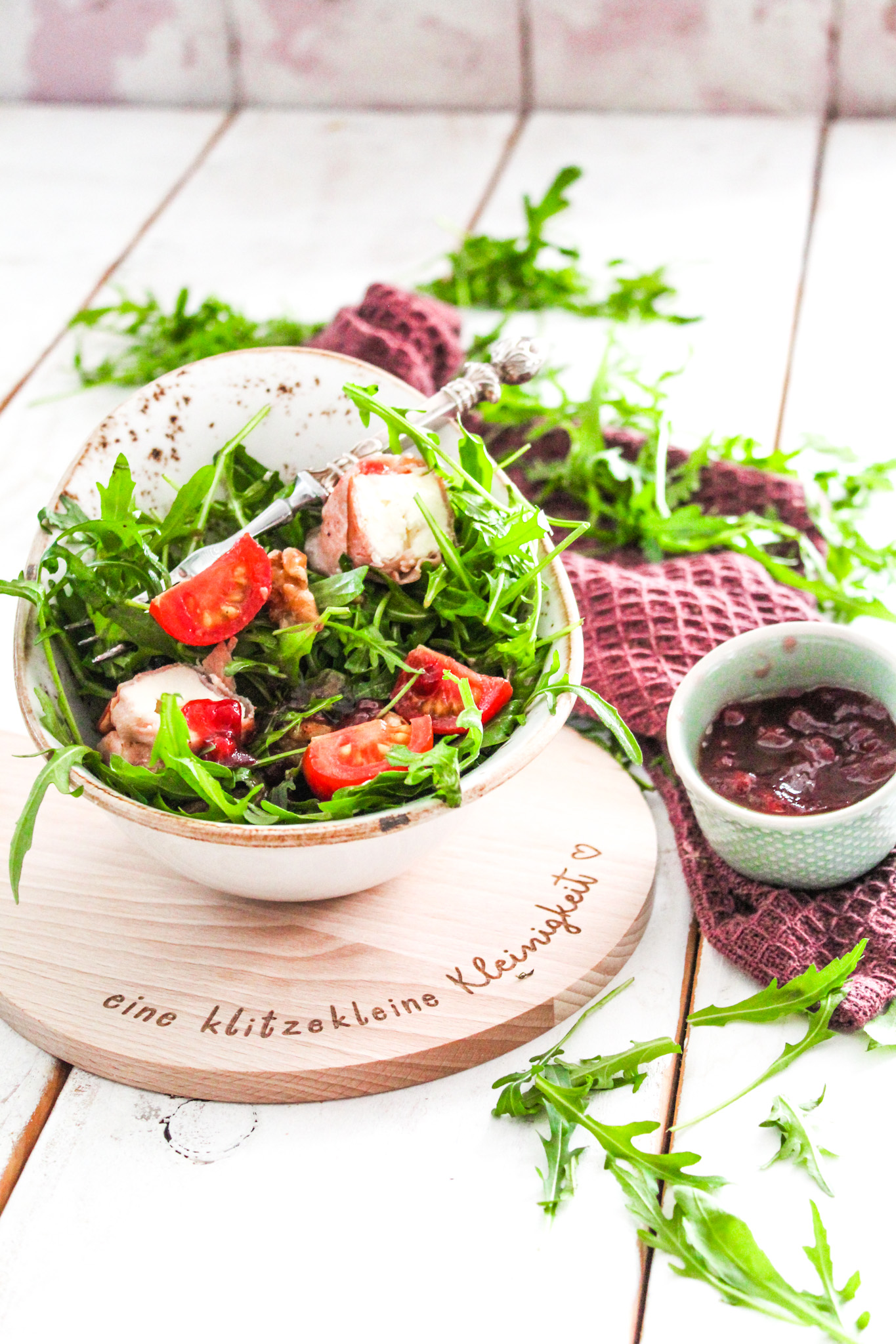Rucola mit Fetaröllchen und Preiselbeer Dressing