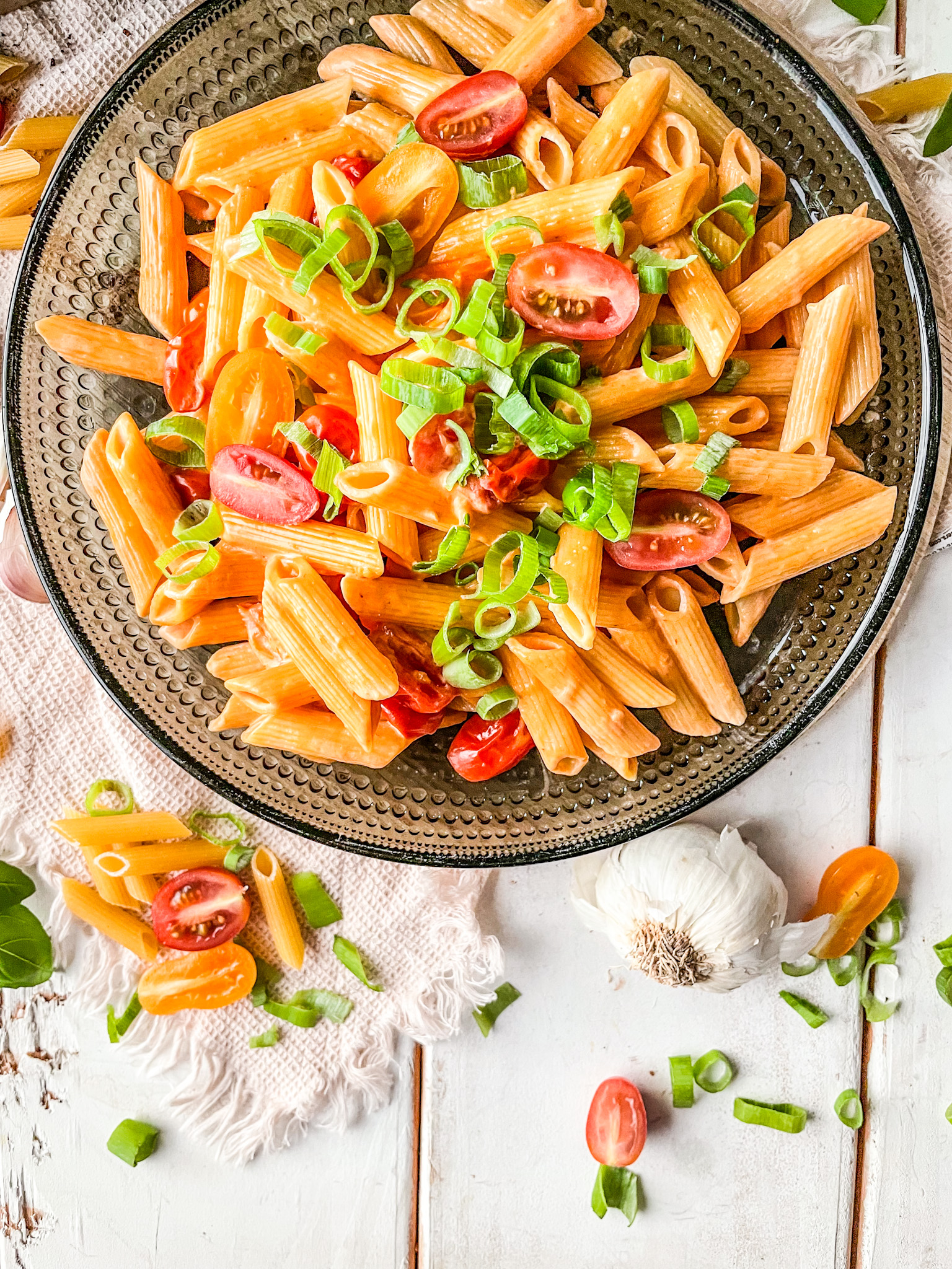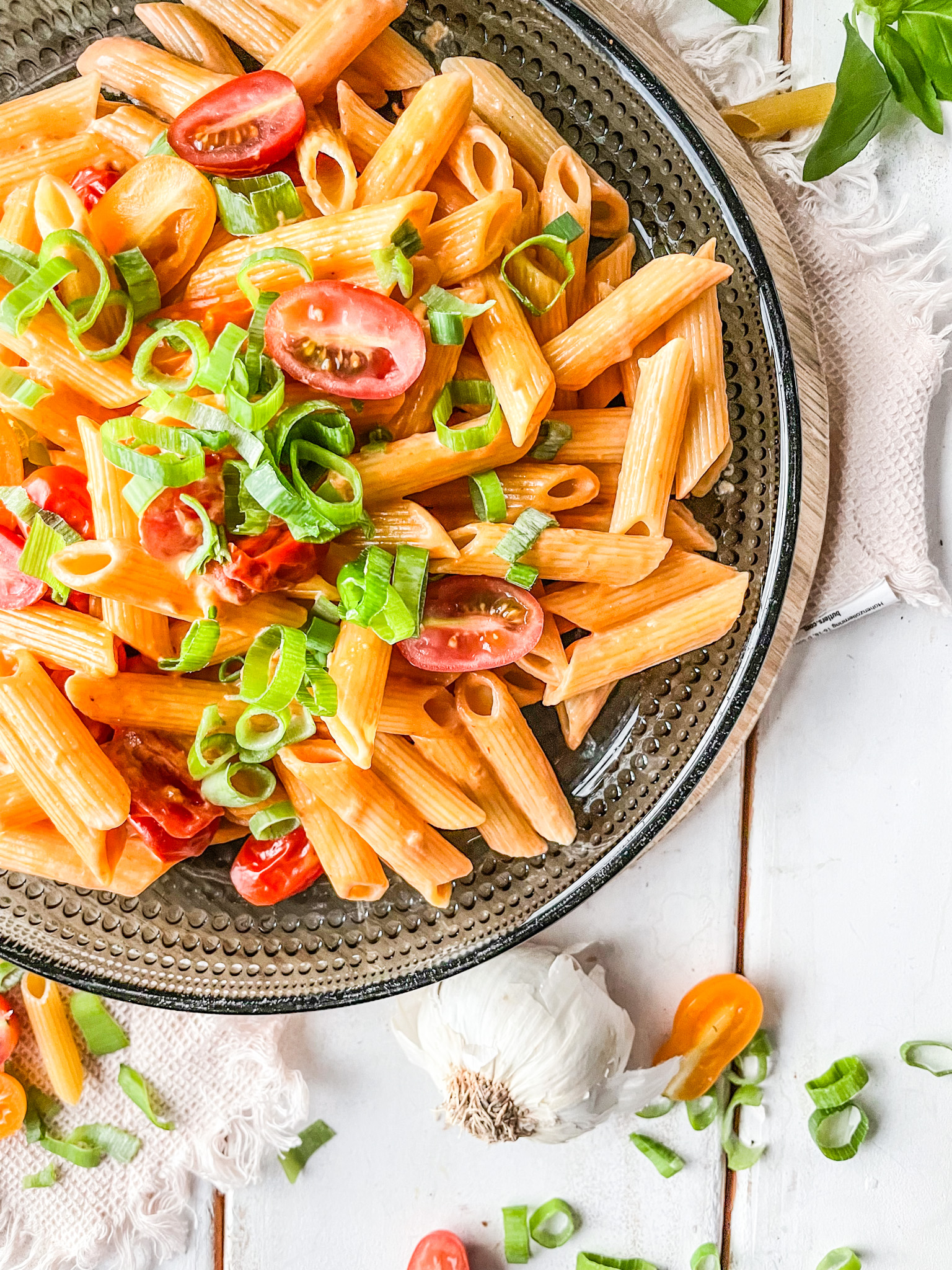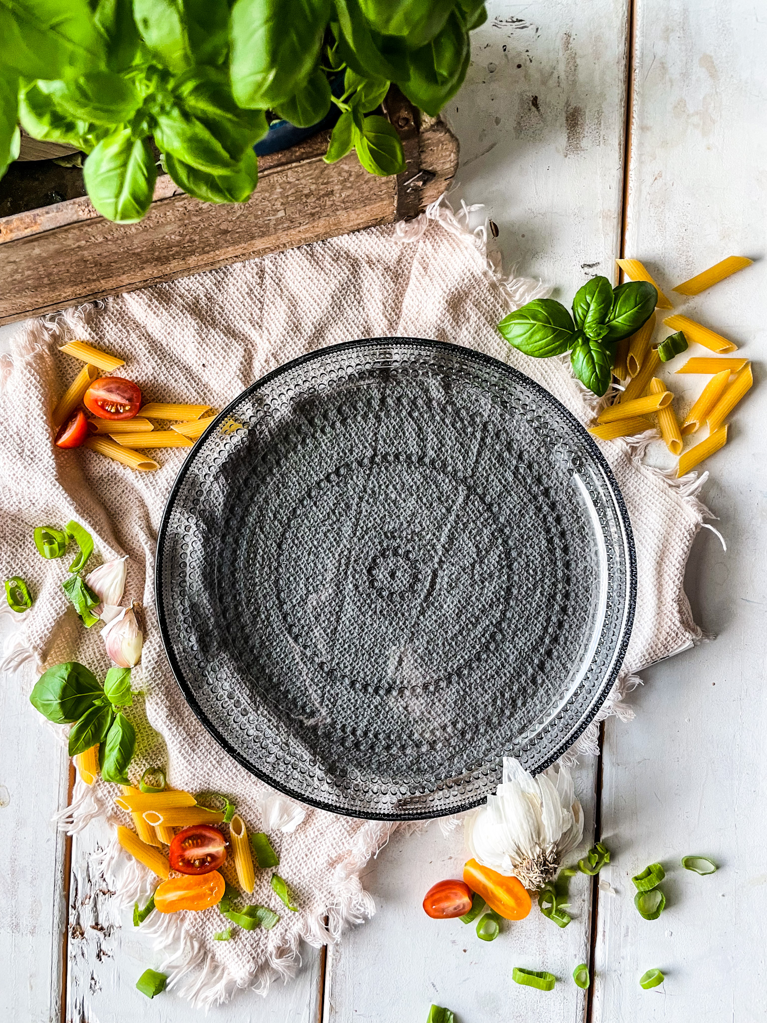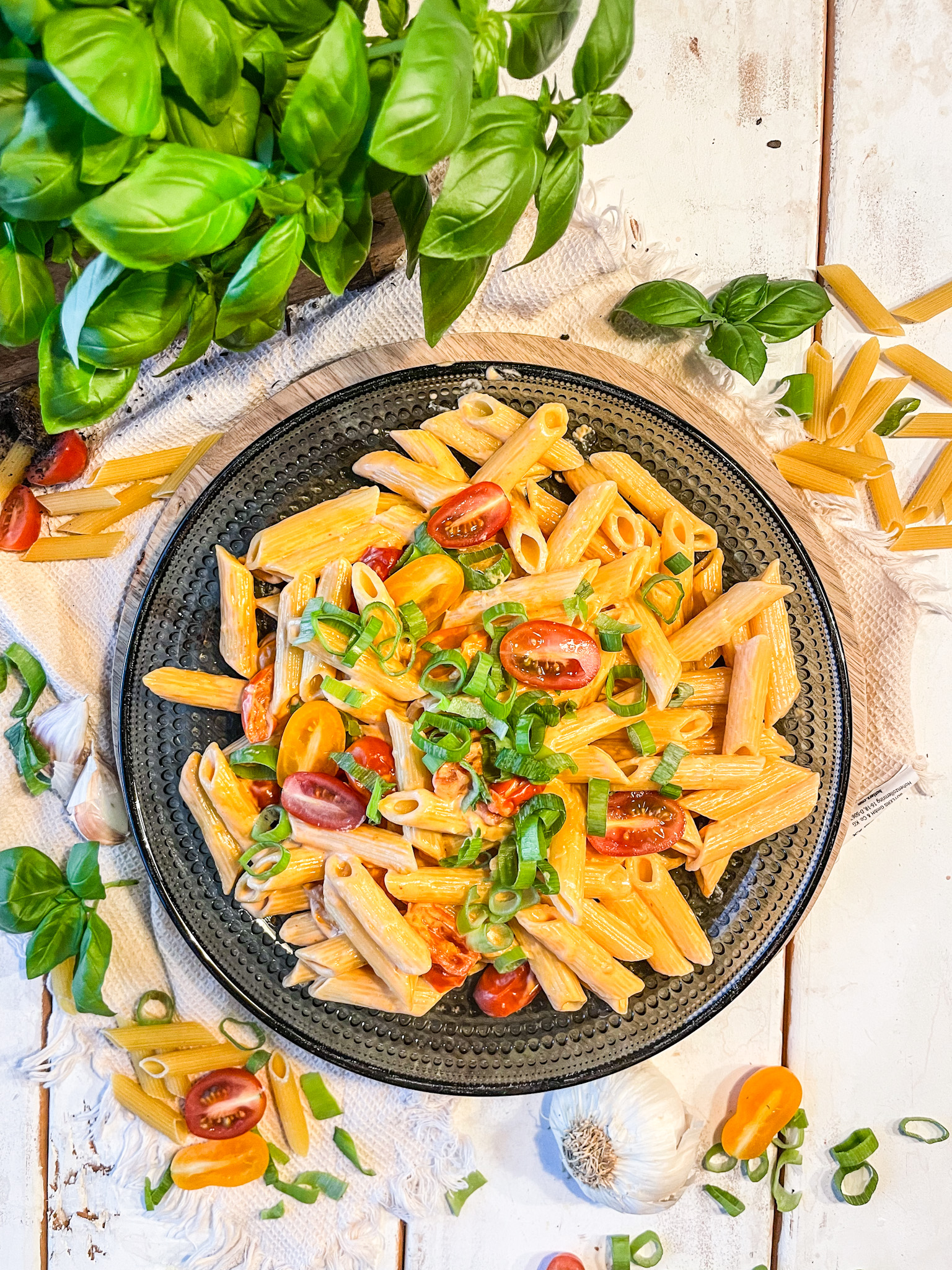 Ich habe mich für Cocktail Tomaten, Lauchzwiebeln und frischen Basilikum entschieden. Lasst uns den Teller füllen.