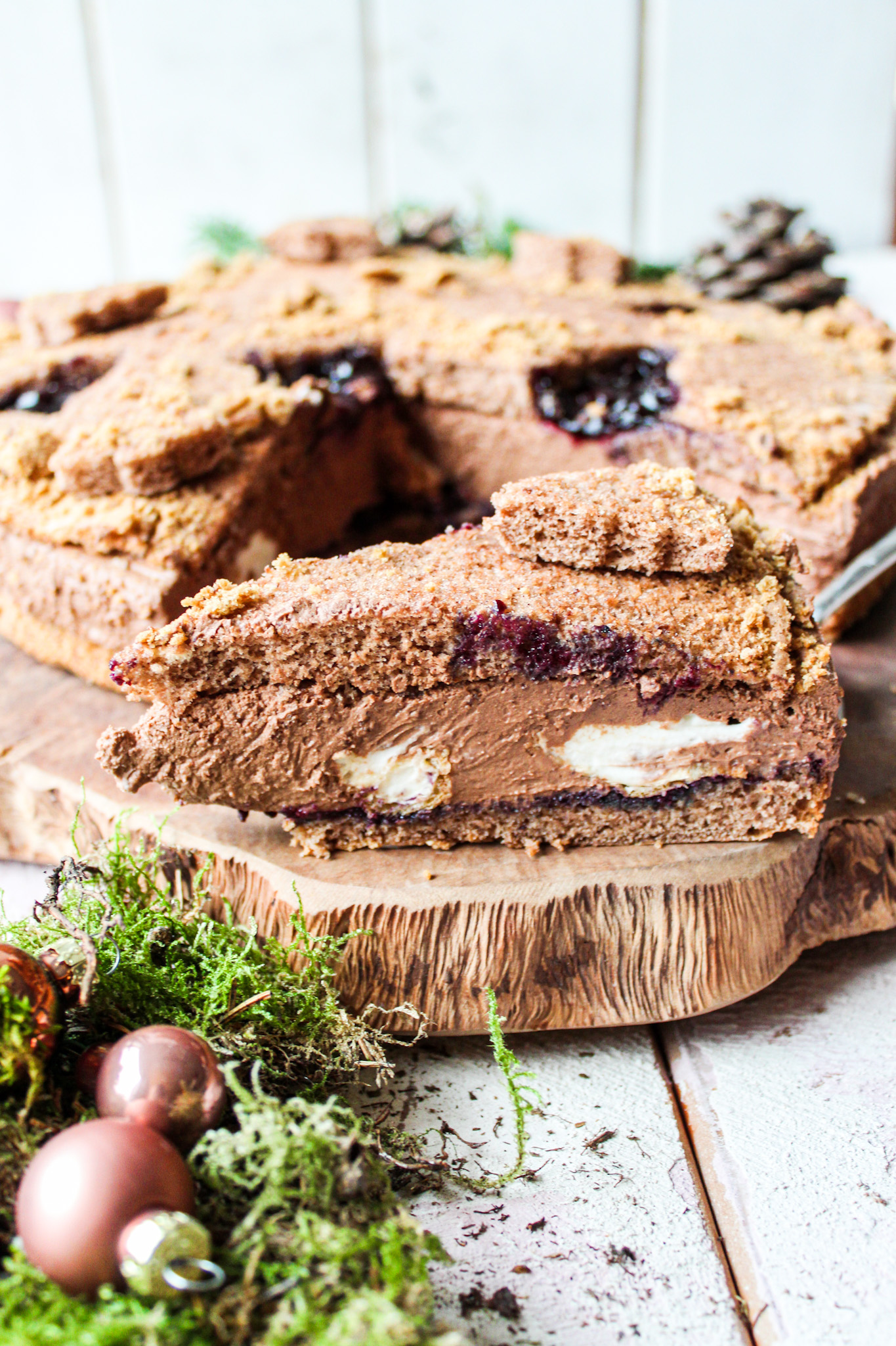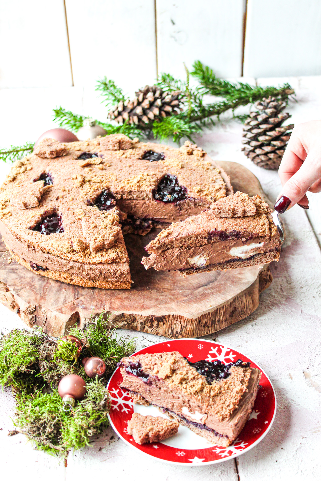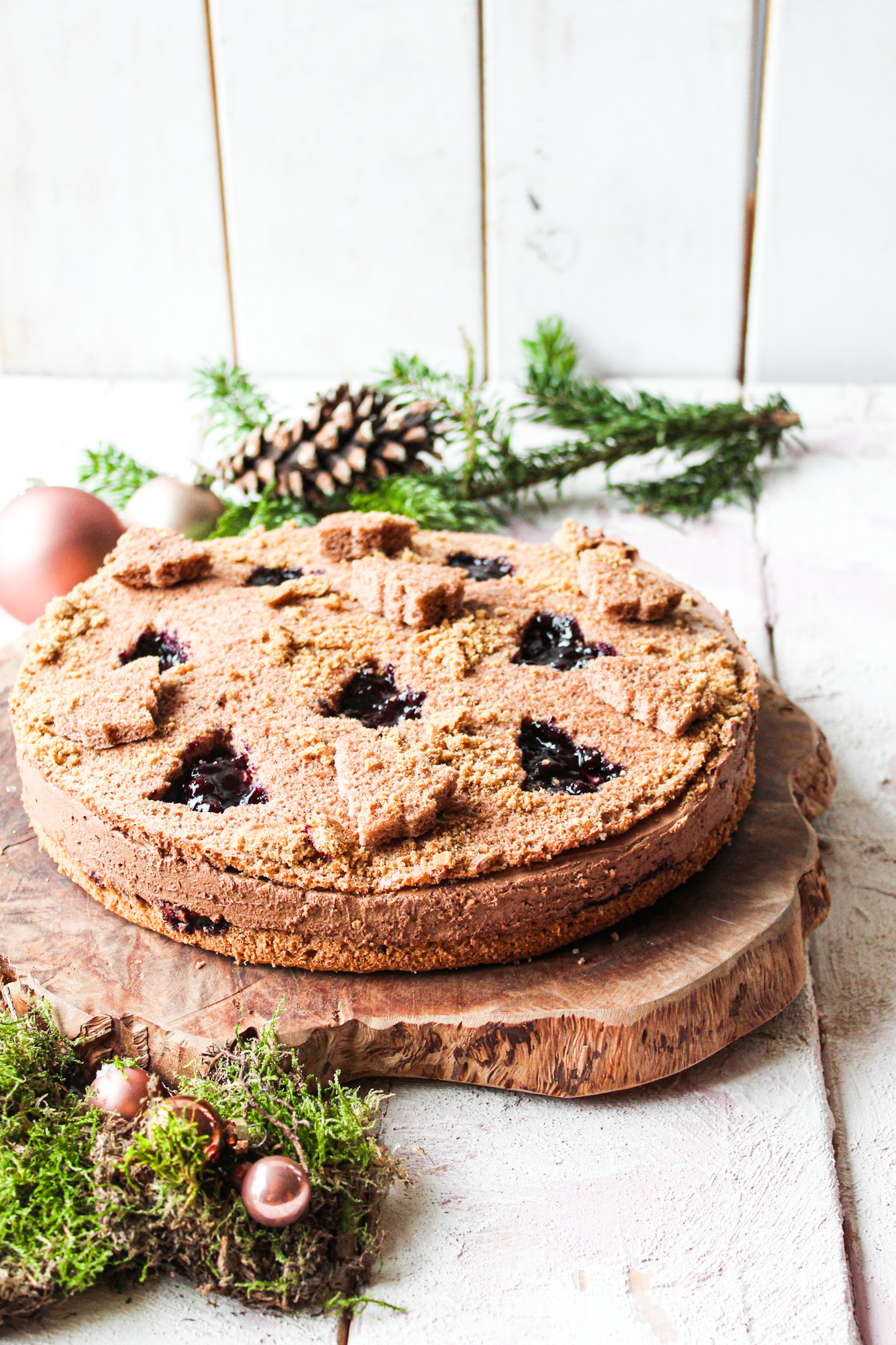 Bei der Auswahl des Ausstechens habt ihr natürlich freie Wahl. Ich habe hier die Tannenbäume gewählt. Ihr teilt die Böden einfach in zwei nach dem Backen und ich verwende dann den unteren Teil als Deckel immer da er schön flach ist. Diesen könnt ihr dann einfach mit den Keksausstecher ausstehen. Wichtig bei der Ganache ist dass ihr sie wirklich eine Stunde in den Kühlschrank stellt zum abkühlen, denn sie kann nur fest aufgeschlagen werden wenn sie komplett kalt ist ansonsten bleibt sie beim Schlagen flüssig.