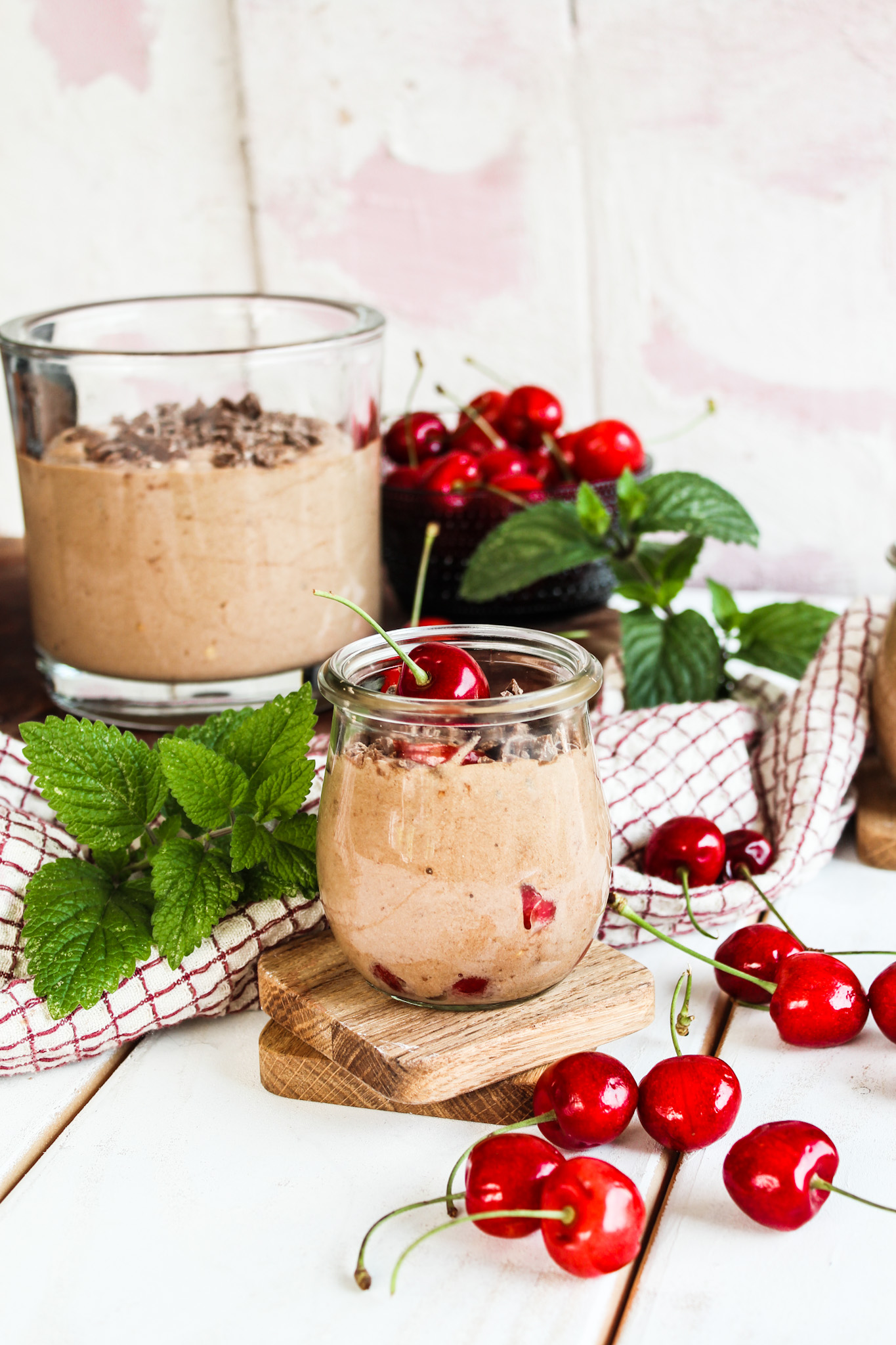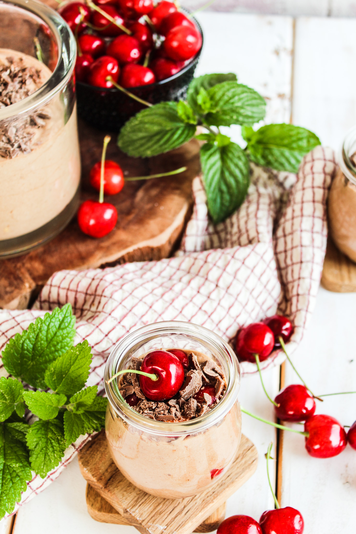 - Die Kirschen unten im Glas legen und mit der Mousse auffüllen. Gehackte Schokolade und Kirschen auflegen und fertig ist euer Dessert