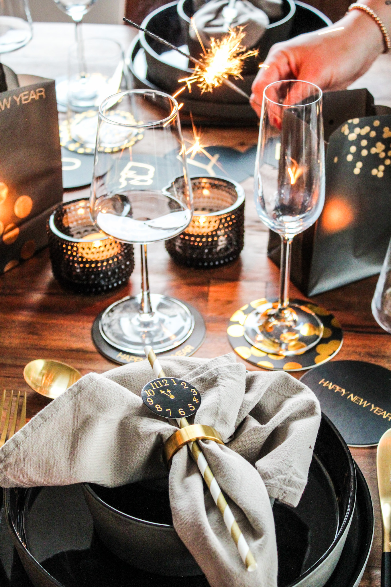 Für die Erwachsenen an dem Abend kann man super schön kleine Prosecco Flaschen oder Dosen, die ich hier in dem Falle genommen habe vorbereiten. Einfach mit einem passenden Strohhalm und einer Wunderkerzen verzieren und schon kann 00:00 Uhr kommen. Ich verlinke Euch hier natürlich alle Silvesterartikel, die ich für den Abend besorgt habe.
