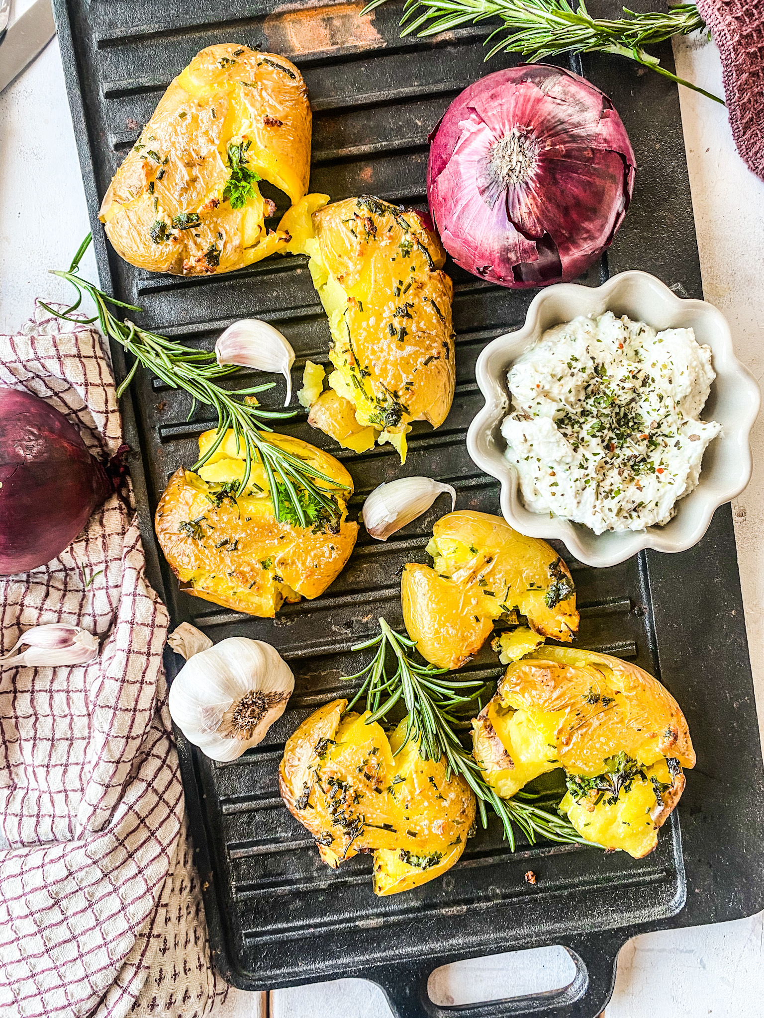 Ich benutze für die Smashed Potatoes immer festkochende Kartoffeln und frische Kräuter aus dem Garten. Petersilie/Schnittlauch/Basilikum alles was der Kräutertopf so her gibt kann auch ruhig mit rein in die Butter.