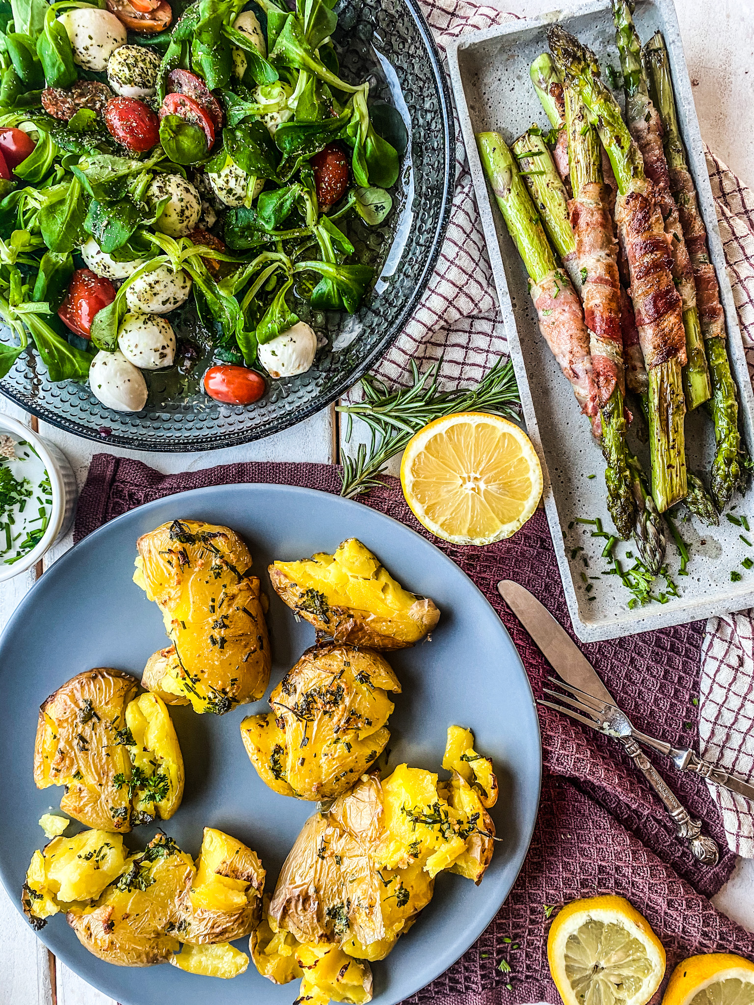 Ich habe zu den Smashed Potatoes passend zur jetzigen Spargelzeit grünen Spargel und einen Feldsalat gemacht. Wirklich super super lecker und einfach mal ein tolles alternatives Gericht. Das Rezept zum Feldsalat und dem Spargel findet ihr auch auf meinem Blog.