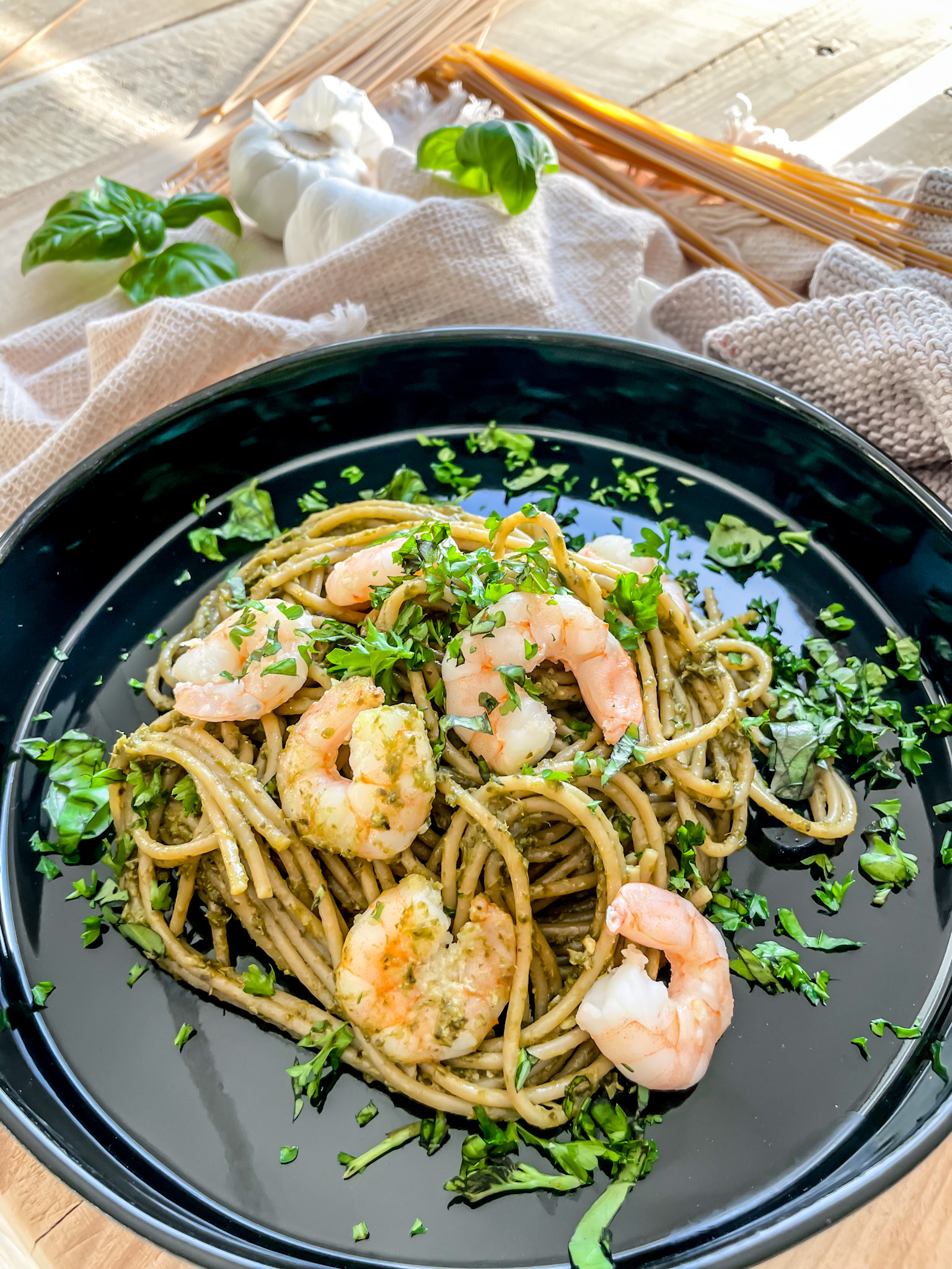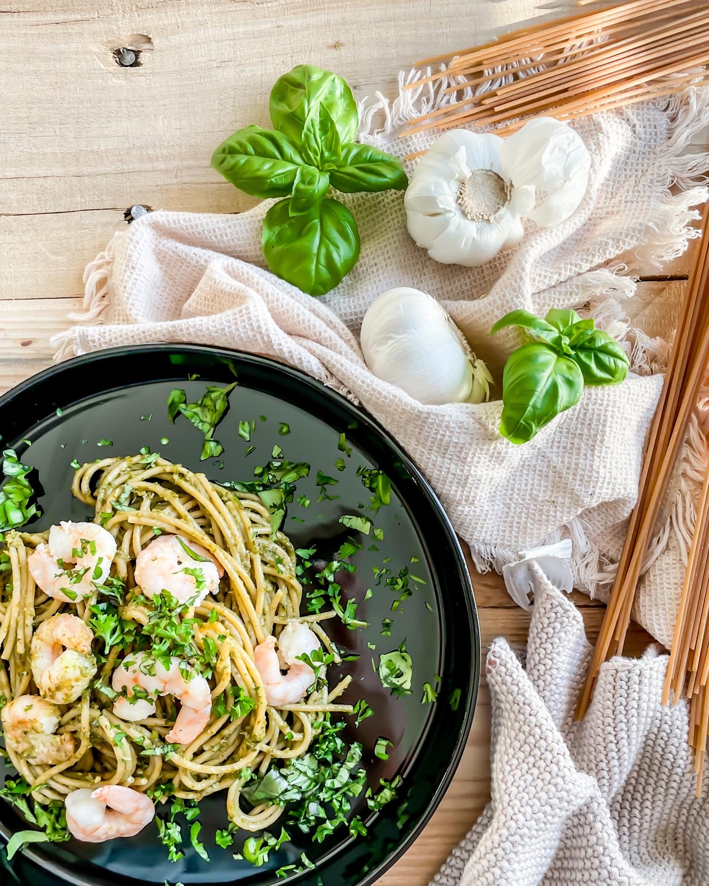 Hast du Lust auf Pesto Spaghetti mit Garnelen?