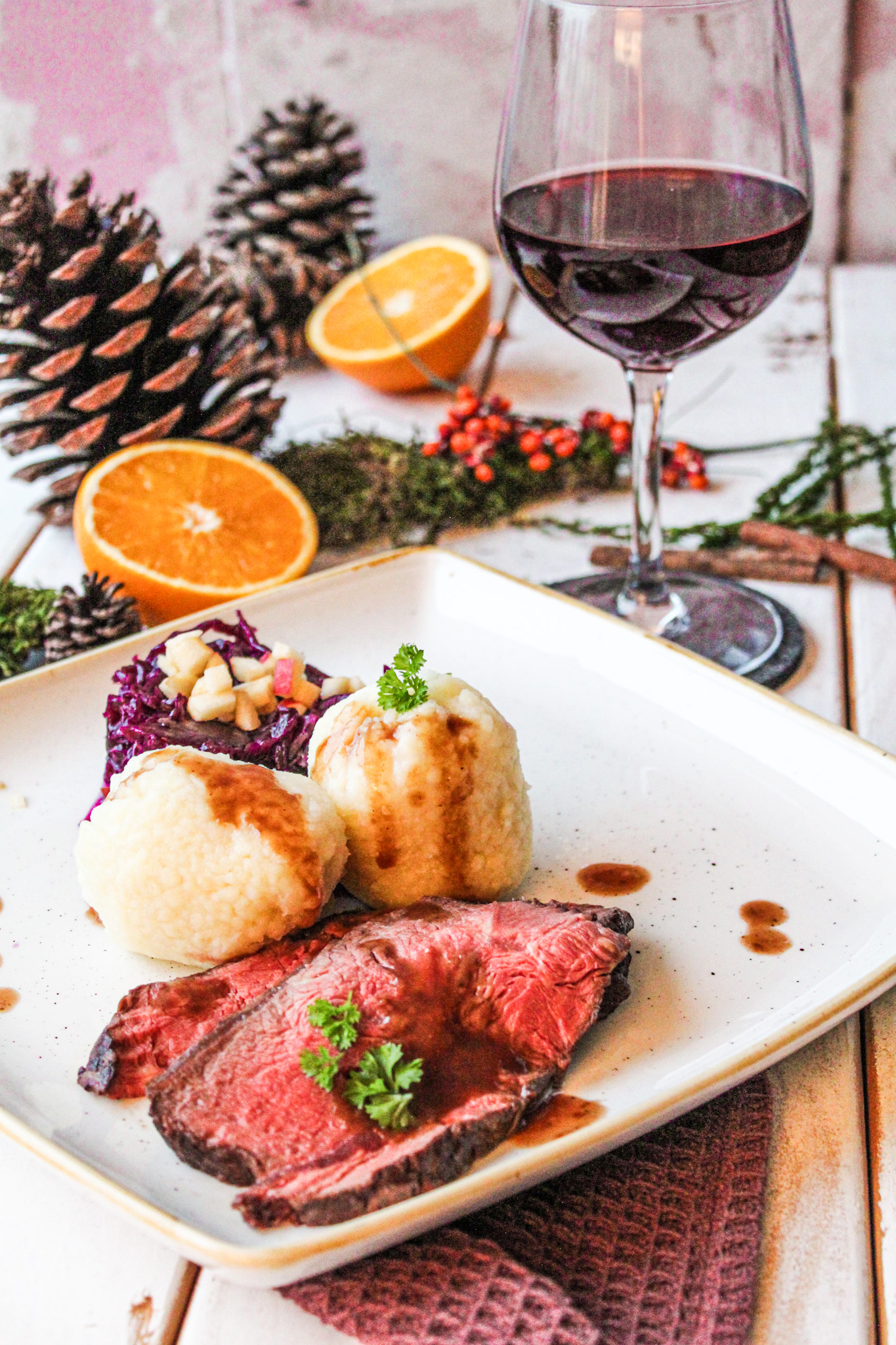- Ich habe dazu Rotkohl und Knödel serviert. Lasst es Euch schmecken.